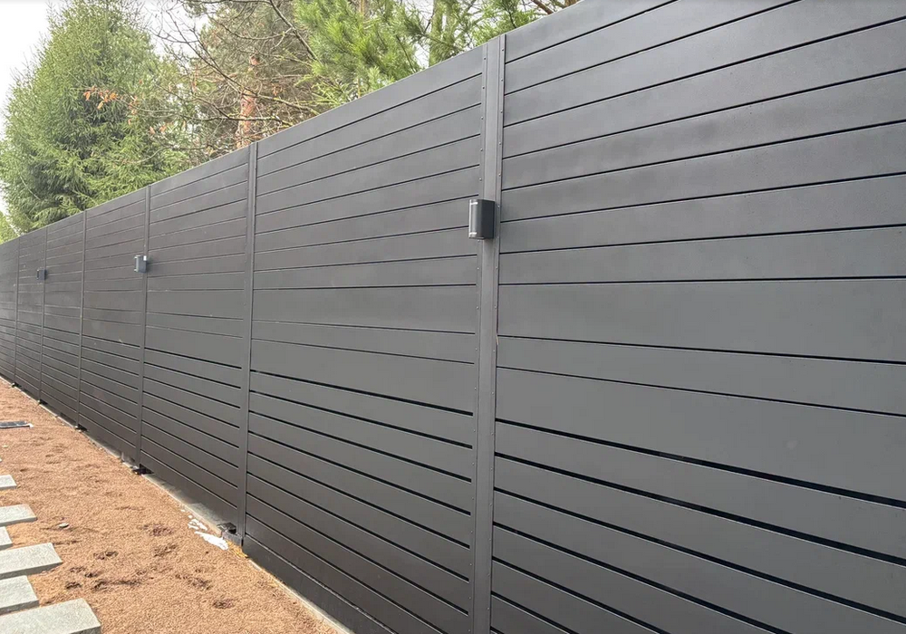 Заборы-ранчо Alubordo от Центра Современных Заборов изготавливаются из горизонтального металлического планкена с толщиной металла 0,7 мм. или 0,9 мм. с полимерно-порошковым покрытием. Это обеспечивает высокую прочность ограждения, отсутствие провисания ламелей, долговечность и эстетичный внешний вид.